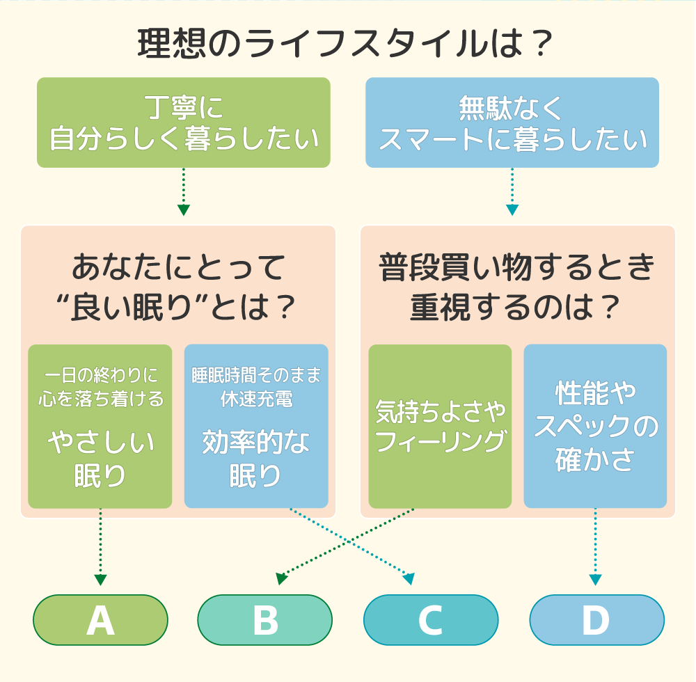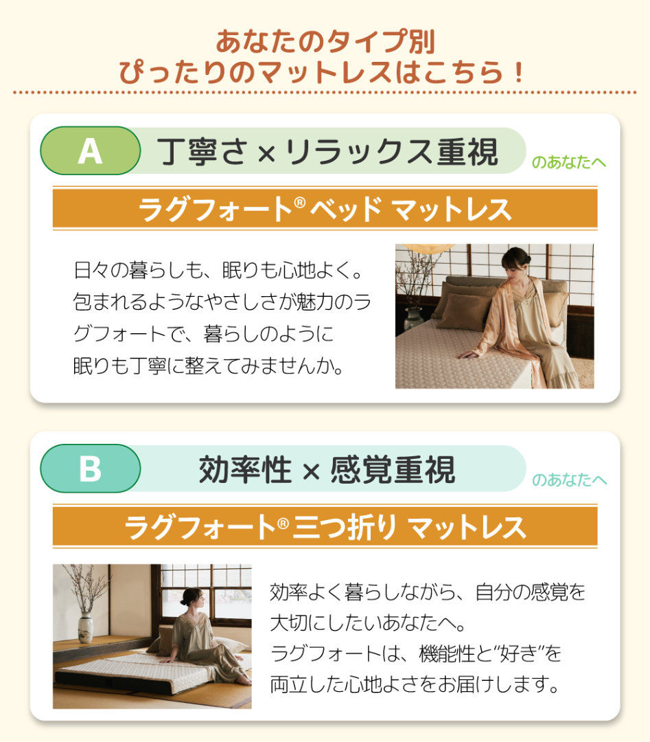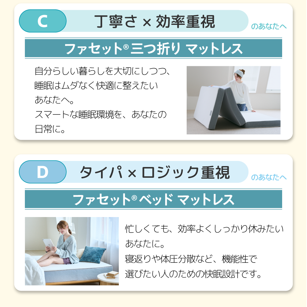 ▼商品をもっと詳しく【A】丁寧さ×リラックス重視のあなたへ ラグフォート®ベッドマットレス【B】効率性×感覚重視のあなたへ ラグフォート®三つ折りマットレス【C】丁寧さ×効率重視のあなたへ ファセット®三つ折りマットレス【D】タイパ×ロジック重視のあなたへ ファセット®ベッドマットレス 一覧に戻る